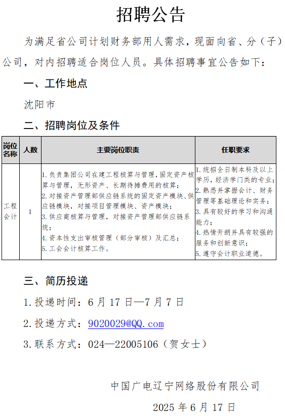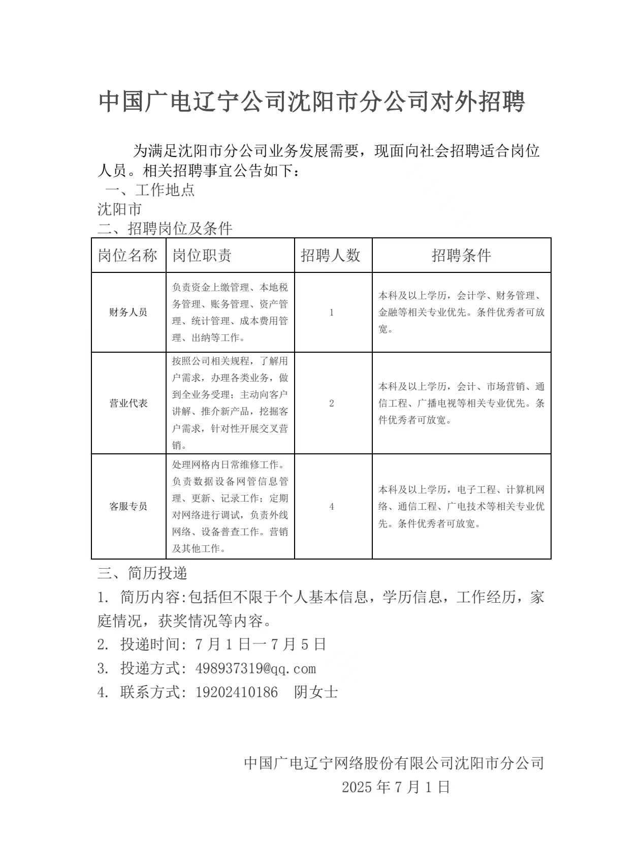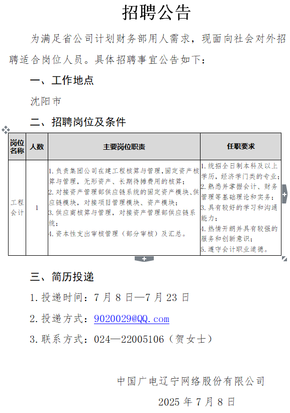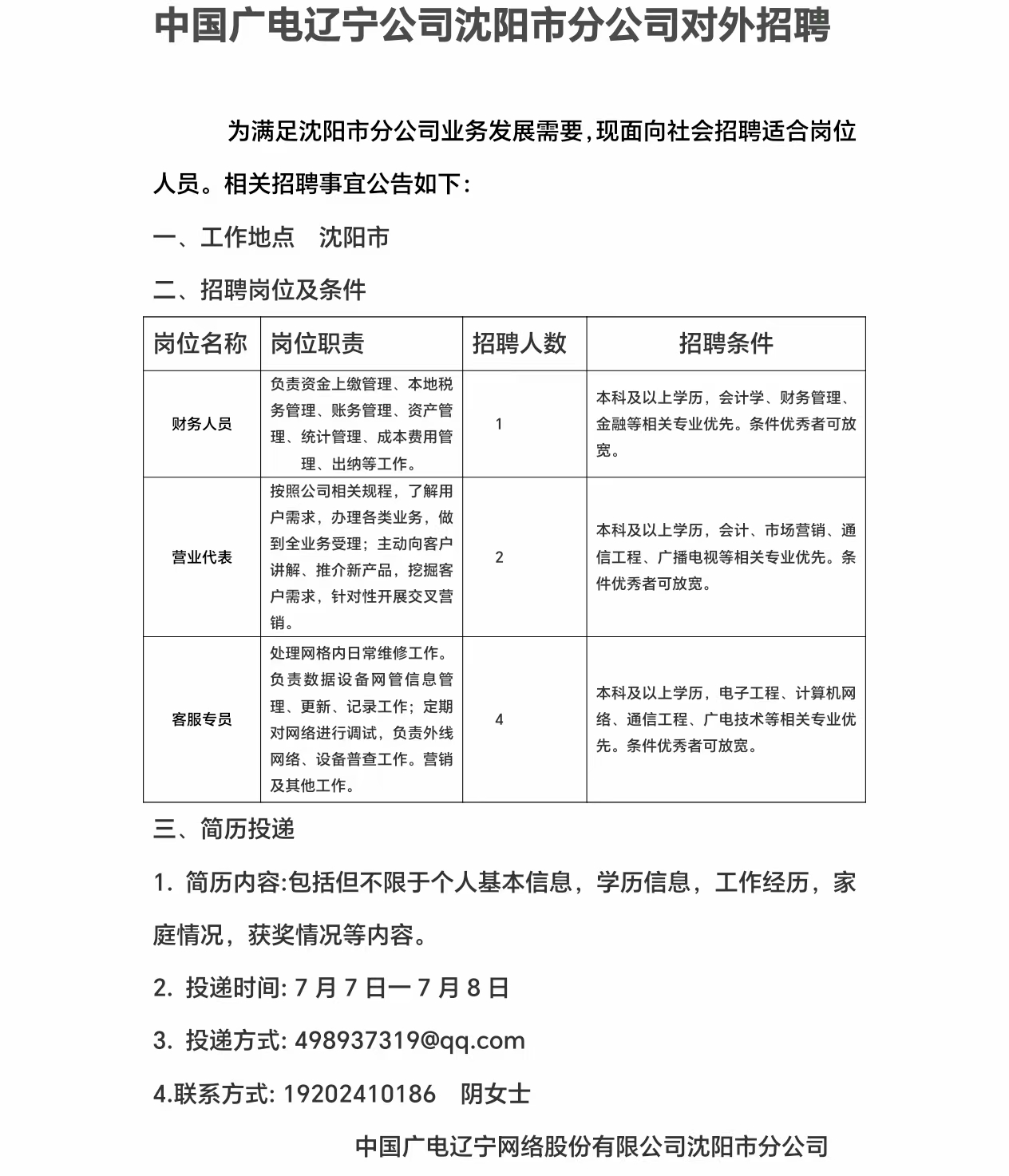 沈陽(yáng)市分公司對(duì)外招聘
