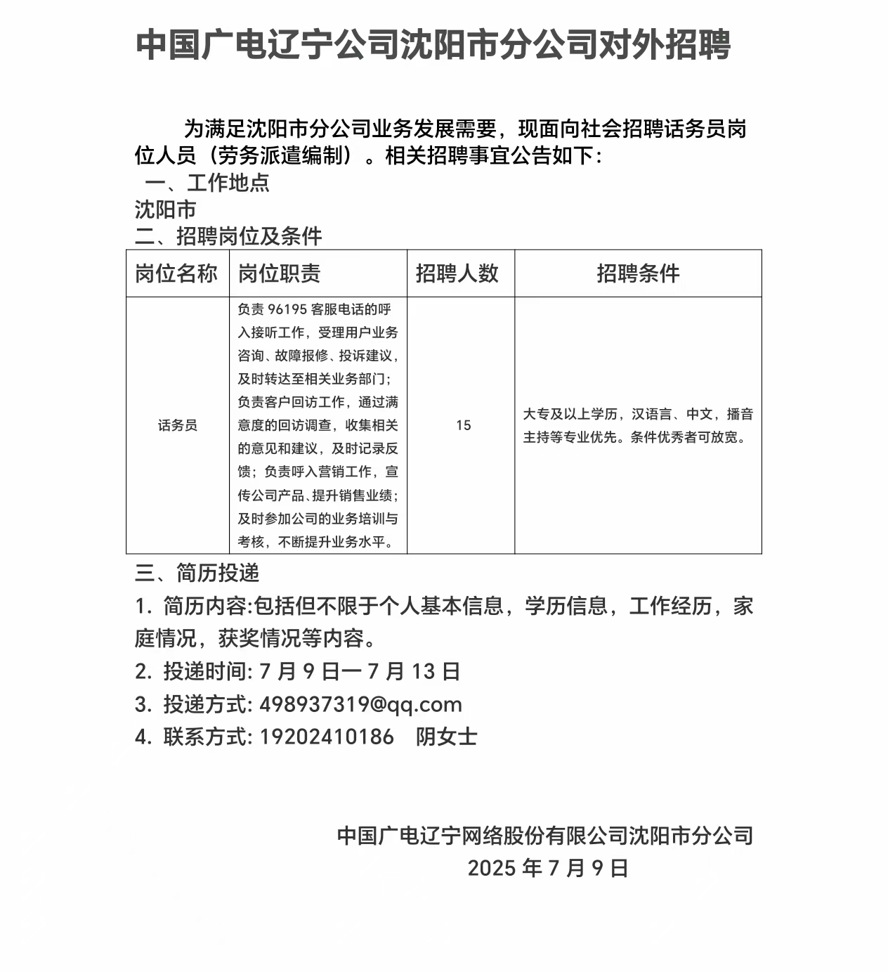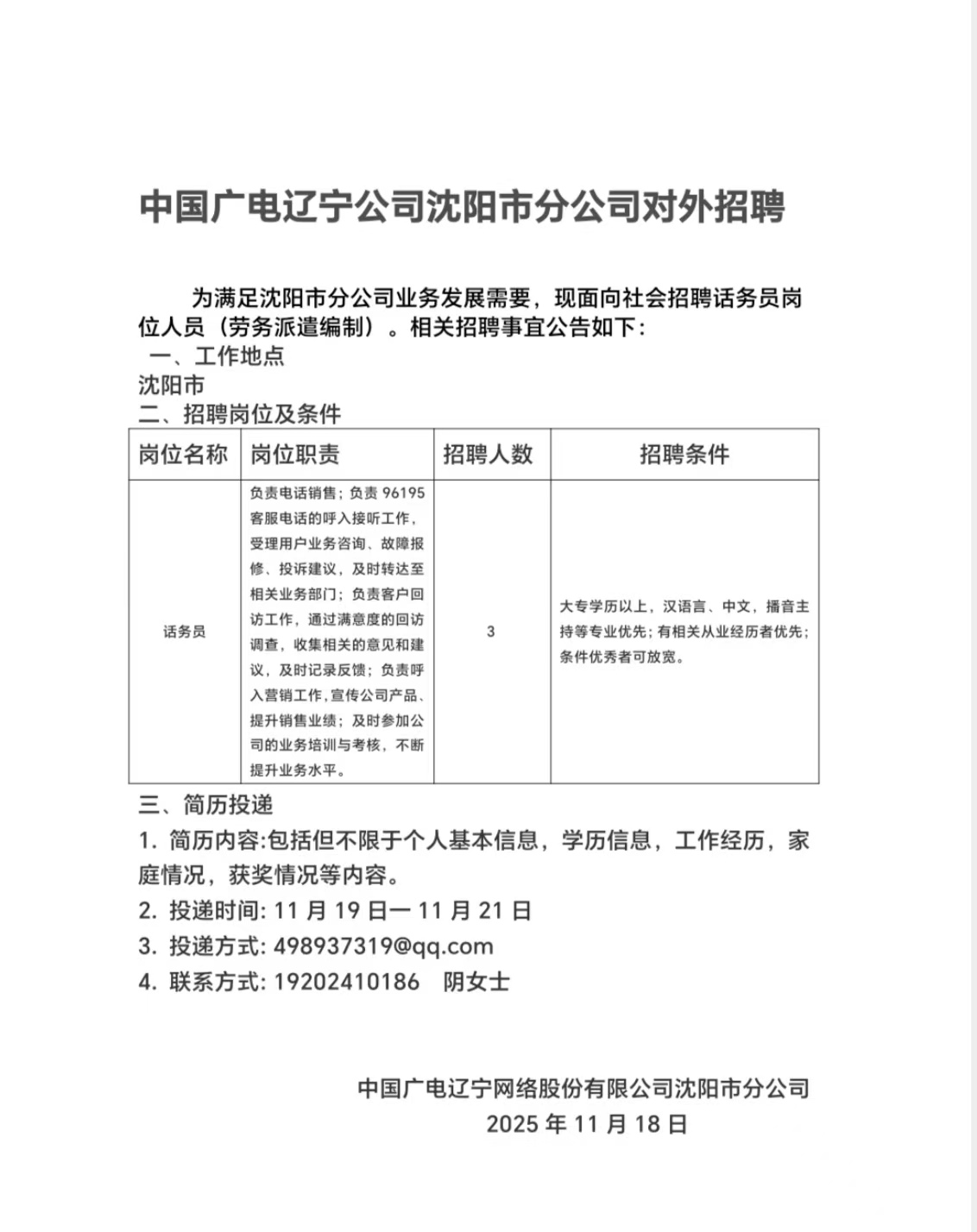 沈陽(yáng)市分公司話務(wù)員崗位外招公告