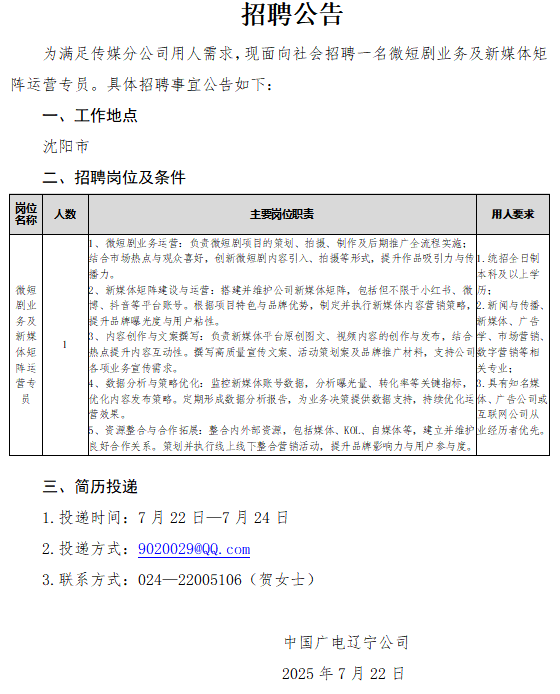 傳媒分公司招聘公告