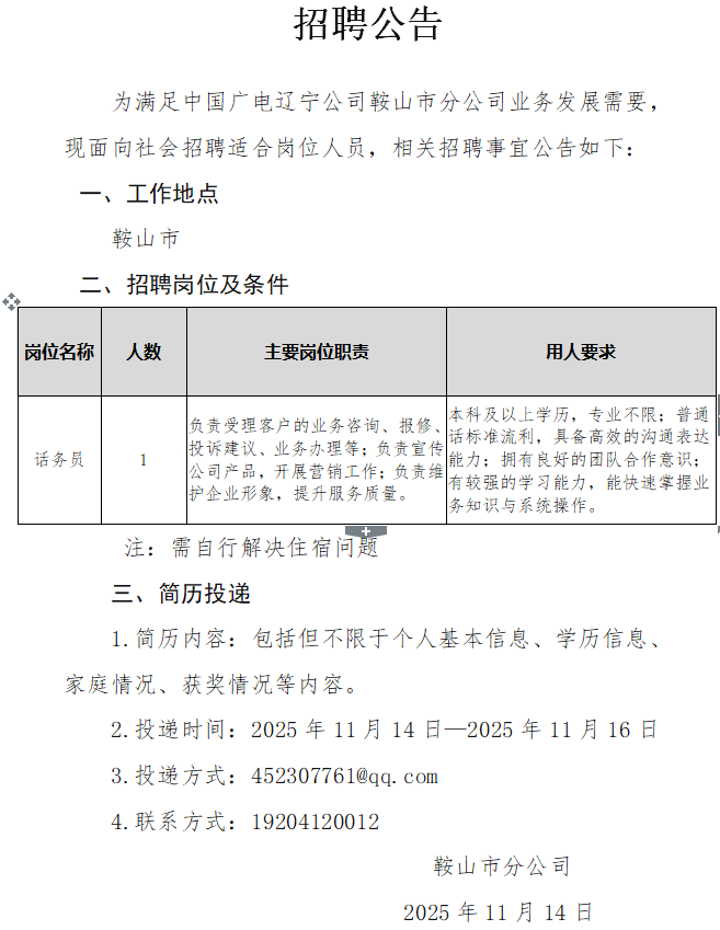 鞍山市分公司招聘公告