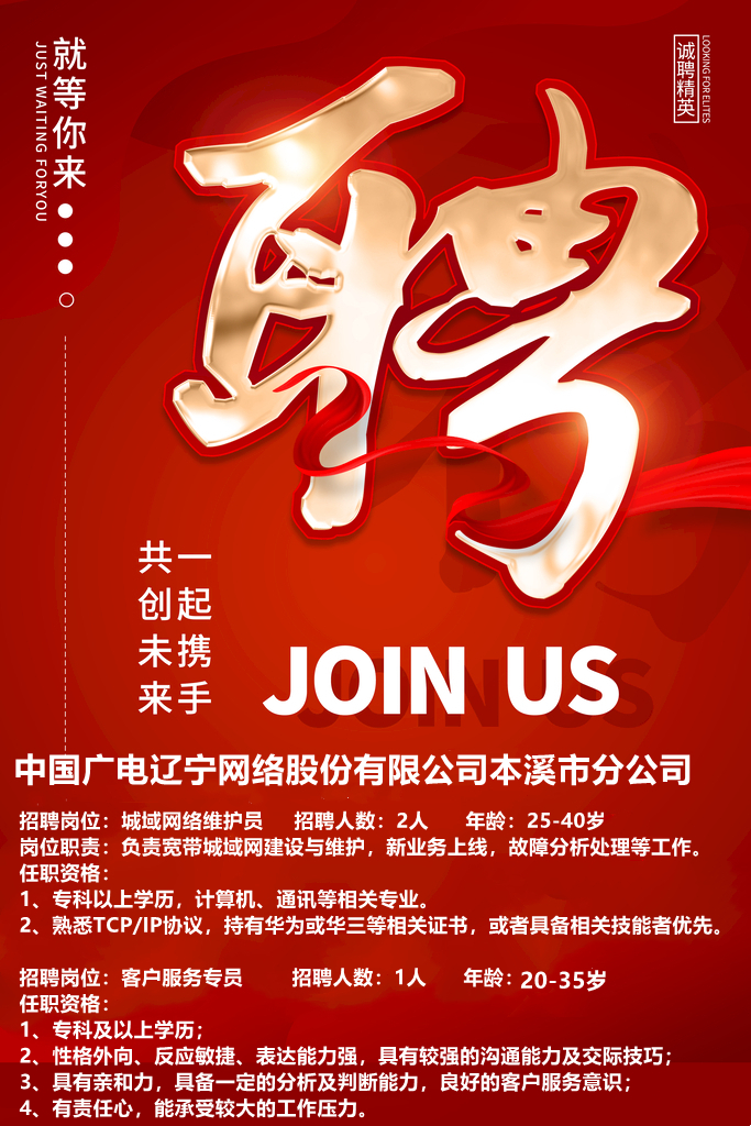 為滿足總公司技術工程部(5G建設中心)對人才的需求,現面向工作地在沈陽的總、分(子)公司招聘適合崗位人員,相關招聘事宜公告如下:
